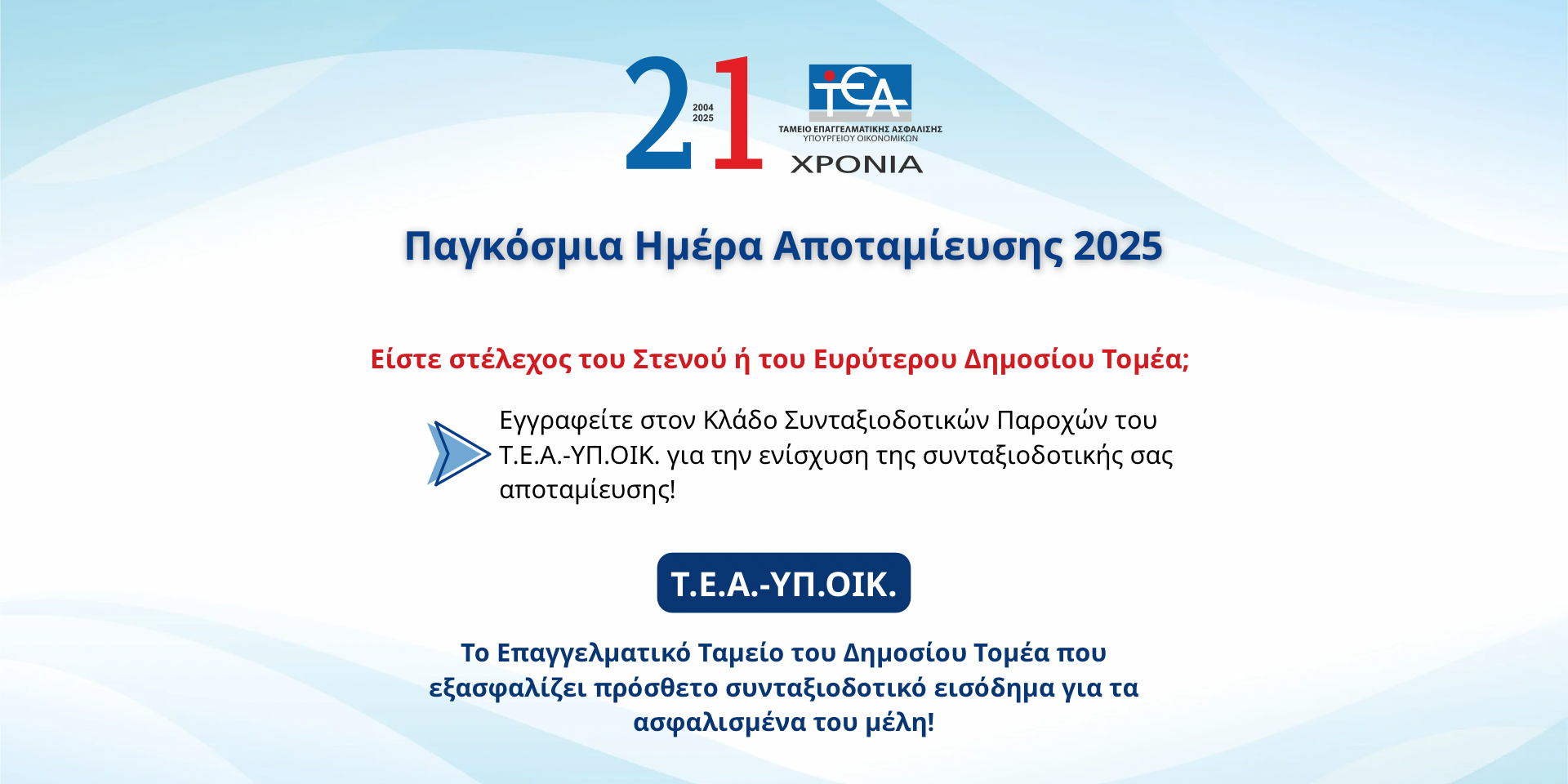 Παγκόσμια Ημέρα Αποταμίευσης 2025: Εγγραφείτε στον Κλάδο Συνταξιοδοτικών Παροχών του Τ.Ε.Α.-ΥΠ.ΟΙΚ.